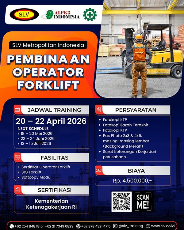 Dalam usaha pencegahan kecelakaan dan penyakit akibat kerja, maka pendidikan dan pelatihan keselamatan kerja (K3) bagi semua level karyawan merupakan hal yang sangat penting dilakukan. Keharusan tersedianya personil dengan kompetensi sebagai operator pesawat angkat angkut di perusahaan berdasarkan Keputusan Menteri Tenaga Kerja No.09/MEN/2010 tentang Pesawat Angkat dan Angkut. Salah satu pesawat angkat angkut adalah forklift. Sebagaimana diketahui bahwa saat ini pada umumnya muatan sudah dikemas dalam bentuk unitisasi sehingga penanganann dibutuhkan alat mesin dan umumnya digunakan forklift. Dalam mengoprasikan pesawat angkat forklift dengan aman dan benar maka d-inline-blockutuhkan tenaga-tenaga operator yang mempunyai skill yang tinggi, dan mempunyai pengetahuan yang cukup tentang dasar-dasar pesawat angkat forklift.