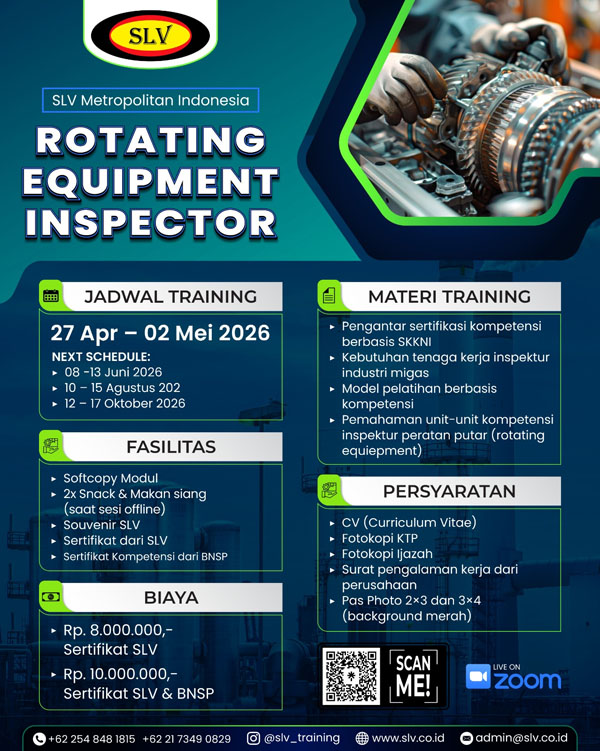 Kegiatan ini merupakan pelatihan sekaligus proses uji kompetensi untuk mengetahui standar kompetensi pada Jabatan Kerja Inspektur Peralatan Putar (Rotating Equipment) yang bertanggung jawab melaksanakan inspeksi setiap penggunaan peralatan putar pada aktivitas pengolahan minyak dan gas dengan mengacu pada SKKNI.