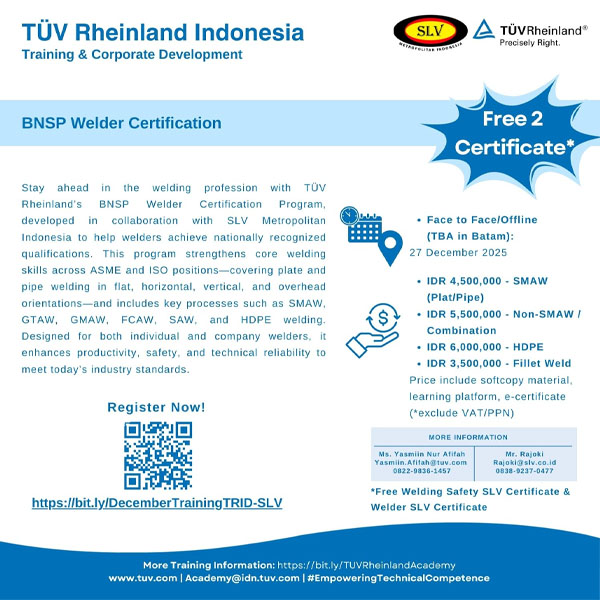 Boost your welding career with TÜV Rheinland’s BNSP-certified program in collaboration with SLV Metropolitan Indonesia! Strengthen your core welding skills across ASME & ISO positions and master key processes such as SMAW, GTAW, GMAW, FCAW, SAW, and HDPE welding.